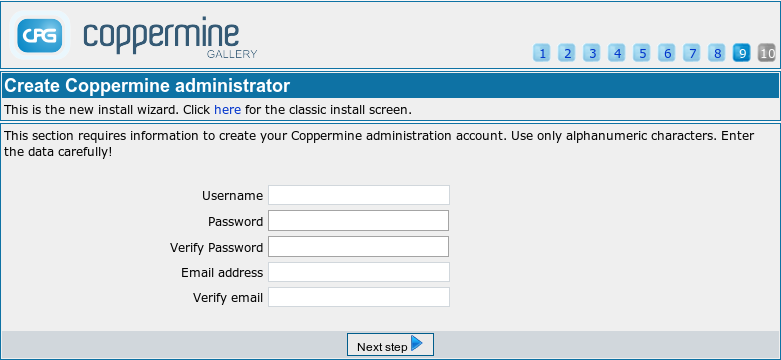 | Password | This will be your admin password to your coppermine install. Don't use trivial, overly abused passwords - if an attacker figures out your password, s/he will be able to hack your entire site! Use a combination of upper and lower case letters and numbers like "j3e4N5n6yG". Remember, passwords like your admin username are case sensitive. Be careful when creating your password. Write it down and keep it safe, preferably somewhere away from your computer. |