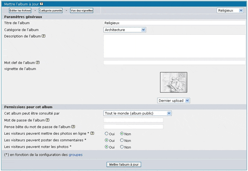 Noter que seuls les visiteurs qui sont membres d'un groupe pour lequel le paramètre "Téléchargement dans les albums publics" (panneau de configuration des groupes) est réglé sur OUI peuvent effectivement télécharger dans les albums.
