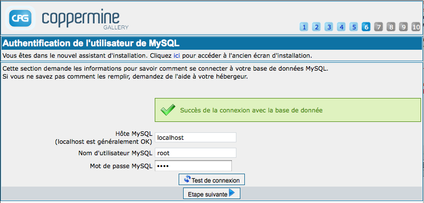 | Your MySQL configuration (votre configuration MySQL) | MySQL est le type de service de base de données disponible sur la plupart des serveurs web. Si vous ne l'avez pas, vous ne pouvez pas l'installer vous-même. Si vous avez un hébergement web, vous êtes probablement malchanceux. Il est obligatoire d'avoir une base de données MySQL pour utiliser Coppermine ou beaucoup d'autres scripts PHP. Vous ne pouvez pas truquer les informations MySQL pendant l'installation, vous devez les connaître avant, et entrer les informations comme demandé. Si vous n'êtes pas sur des informations requises, demandez votre hébergeur. |