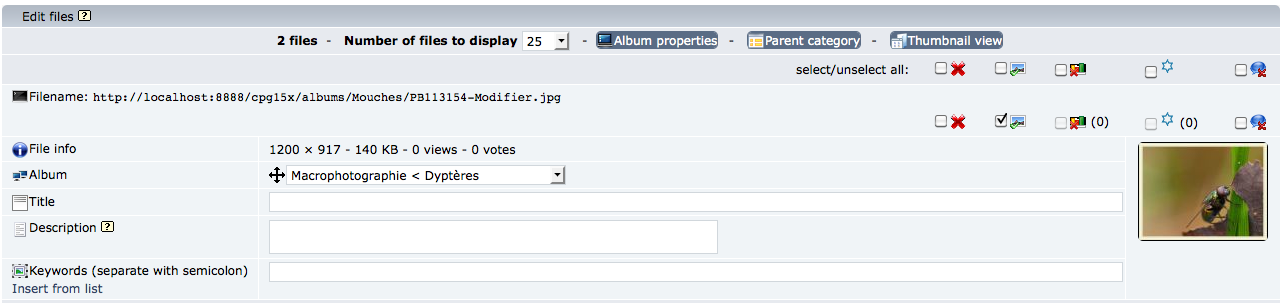 FTP upload both the video and (thumbnail or image) then batch-add. If you FTP upload the thumbnail, the thumbnail will be display in the batch add page instead of the default Coppermine thumbnail. If you upload an image it will look like the above screenshot. However, when the both files are added to the database, the thumbnail of the image will be used by the video.Note: If the first method is used and the image later deleted, the thumbnail will also be deleted and the default Coppermine thumbnails will be displayed, instead.
